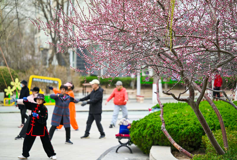 3月17日,人们在银川市金凤区民生城市花园小区晨练。近日,漫步银川,从小区庭院到公园湖畔,从城市广场到街角路旁,草木舒展、繁花似锦。近年来,银川持续厚植绿色家底,扎实推进绿化提质、湿地修复、环境治理,让蓝天常在、碧水长流、绿树成荫,生态宜居的幸福底色愈发鲜明。 记者 马楠 王洋 摄