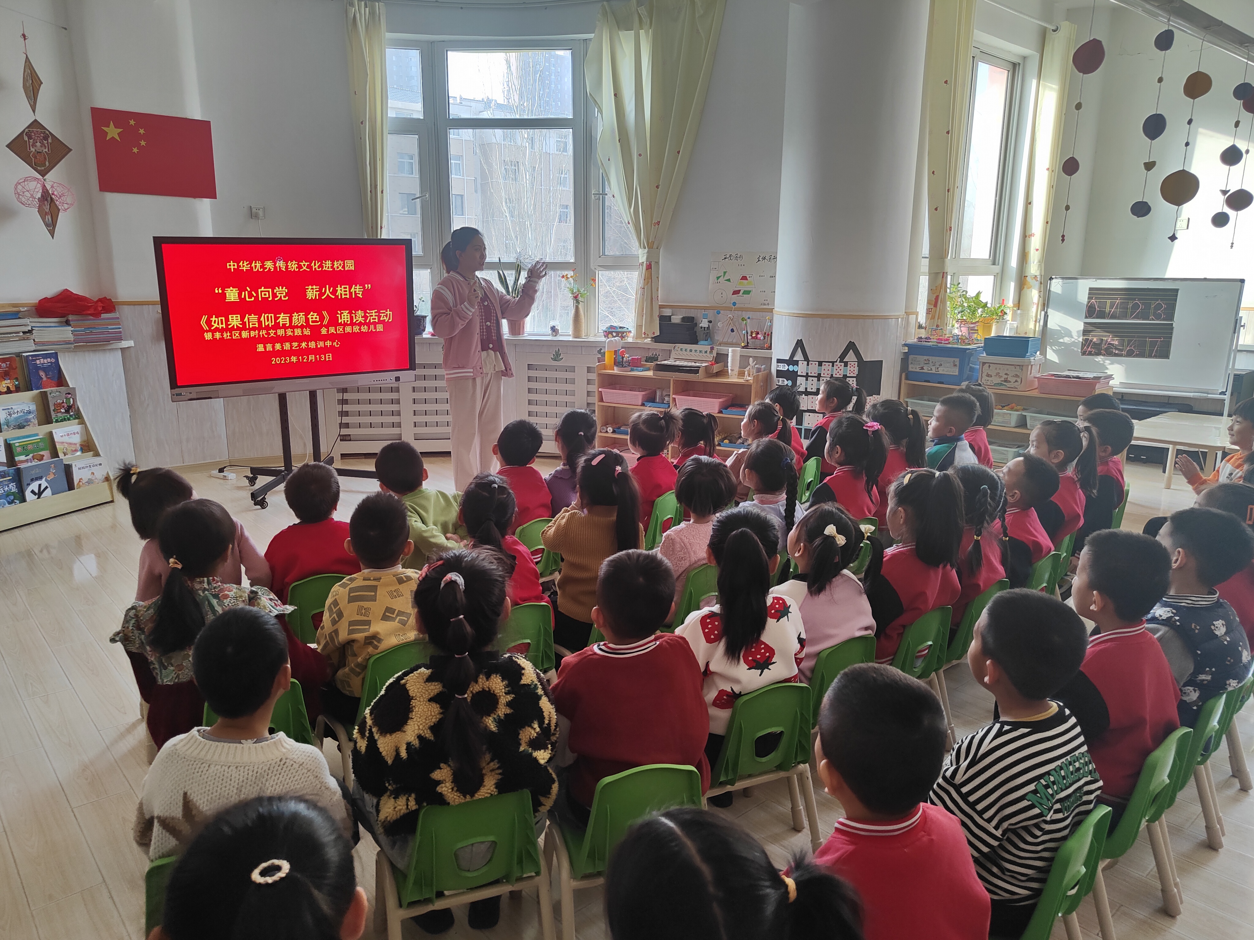 于心,同时也激 发幼儿内心深处的爱国情怀,让幼儿体会到幸福生活的来之不易,从而懂得珍惜与感恩。随后,老师现场进行教学幼儿诗歌《如果信仰有颜色》,耐心细致地为大家讲解每一句的情感所在,让孩子们学会表达诗句中的情感,抒发自己内心的感受。一行行充满激情的句子在抑扬顿挫的朗诵声中传到每一名小朋友的心中,铿锵有力的语句诵出了对祖国的热爱之情!