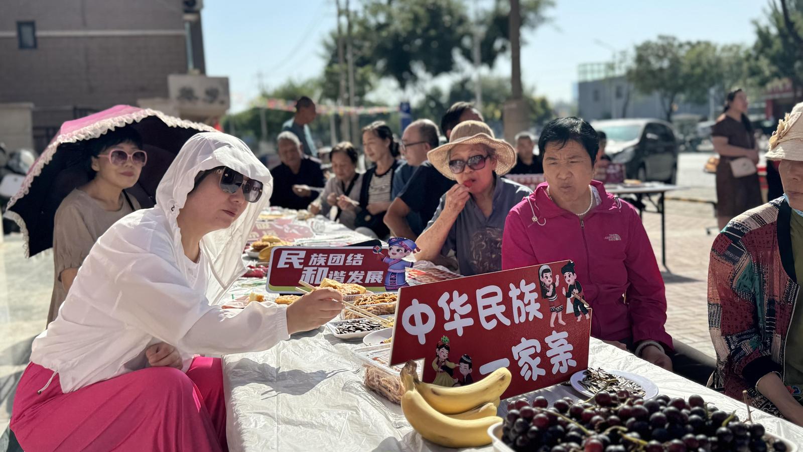9月10日,银川市金凤区满城北街街道彩虹湾社区笑声不断,在“邻里齐聚百家宴·共绘彩虹幸福篇”民族团结月活动中,回族、汉族、蒙古族、满族等7个民族居民欢聚一堂,以美食为媒,共同谱写“民族团结一家亲”乐章。