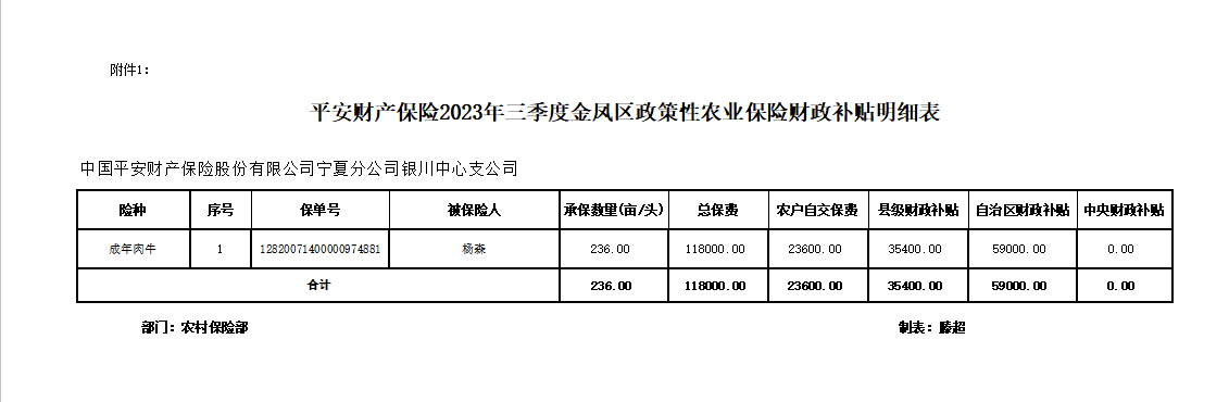 按照《金凤区农业保险保险费补贴管理实施方案》相关规定,中国平安财产保险股份有限公司宁夏分公司银川中心支公司按照遴选结果,在金凤区开展了养殖业保险,并经金凤区农业农村和水务局验收审核,现将2023年第三季度养殖业保险明细公示如下,公示期2023年10月30日至2023年11月3日,共5个工作日。如有疑问,请致电0951--5036303。