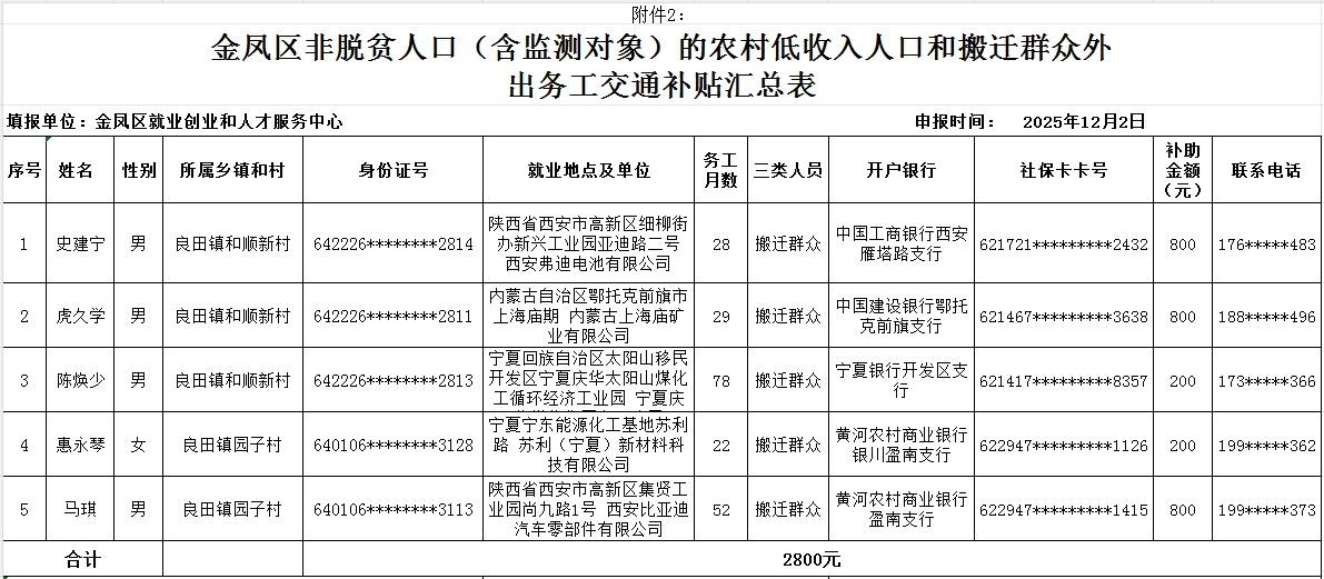 附件2:金凤区非脱贫人口(含监测对象)的农村低收入人口和搬迁群众外出务工交通补贴汇总表( 5人:2800元)