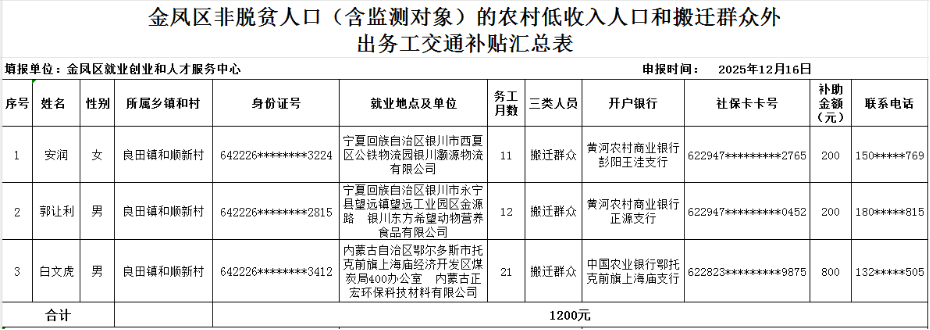 附件:金凤区非脱贫人口(含监测对象)的农村低收入人口和搬迁群众外出务工交通补贴汇总表(3人1200元)