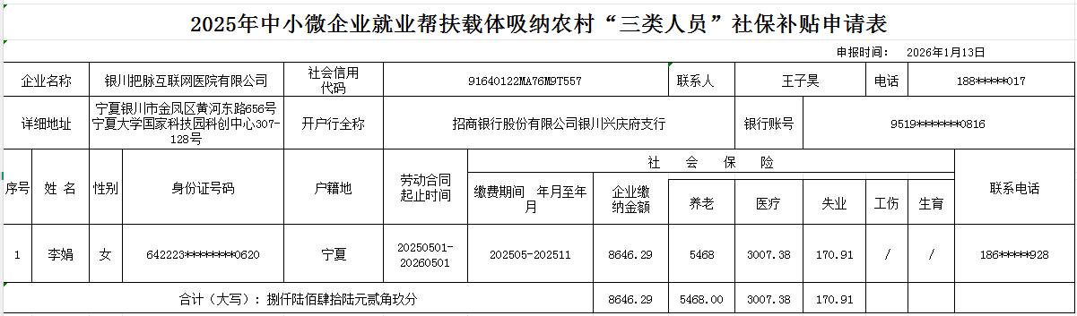 根据《银川市人社局 发展改革委 财政局 农业农村局关于落实加强就业帮扶实施百万移民致富提升行动巩固脱贫攻坚成果助力乡村振兴的实施意见工作规范流程的通知》(银人社发〔2022〕4号)文件要求,经单位自主申报、所在地街道(乡镇)初审、人社局和农业农村水务局联合复审等程序,银川把脉互联网医院有限公司吸纳“三类人员”符合申报企业吸纳社保补贴条件,企业吸纳李娟1人,补贴资金共计8646.29元。现将申请单位相关信息予以公示(名单详见附件 )。