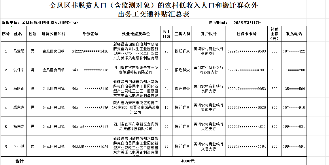 附件:金凤区非脱贫人口(含监测对象)的农村低收入人口和搬迁群众外出务工交通补贴汇总表(6人4800元)