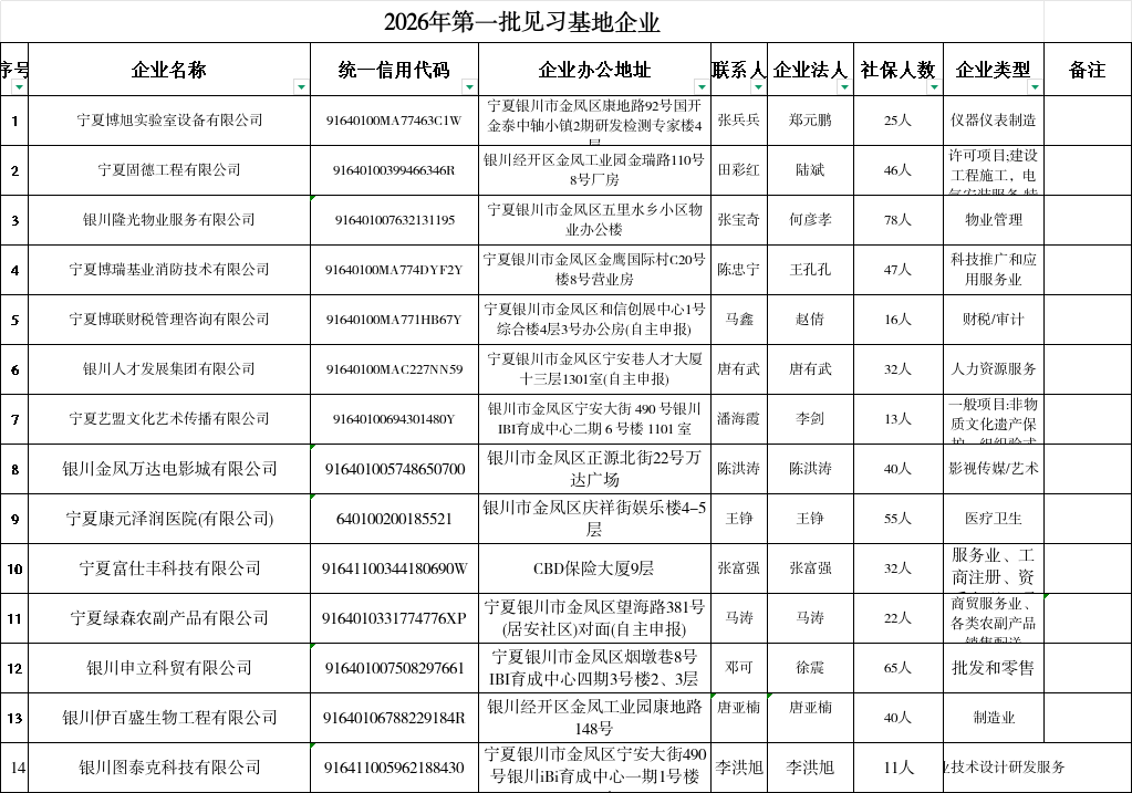 为贯彻落实自治区人力资源和社会保障厅关于印发《宁夏回族自治区青年就业见习管理办法(试行)的通知》(宁人社规字〔2023〕10号)要求,更好的促进广大青年就业创业,经企业和社会组织前期申报,金凤区就业创业和人才服务中心审核、实地考察、评审,经中心会议研究,确定宁夏固德工程有限公司、宁夏博旭实验室设备有限公司等14家生产经营正常、劳动关系健全、生产安全有保障的企业(具体名单附后)为2026年银川市金凤区第一批青年就业见习单位。现向社会公示,公示期为2026年3月18日至3月24日(5个工作日)。