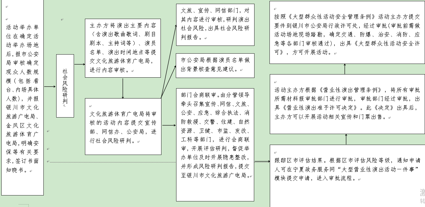 2.提请上级部门审批。由文化旅游体育广电局牵头,向市文化旅游广电局、自治区文化和旅游厅提交《大型演出活动风险评估表》,按照审批流程和受理权限21日之内完成《宁夏回族自治区营业性演出准予许可决定》办理工作。