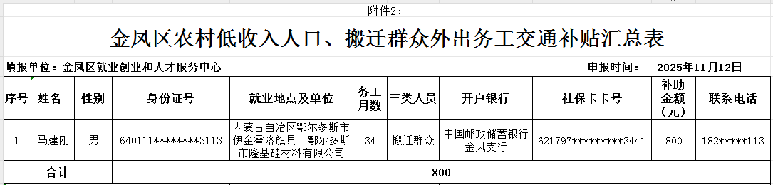附件2:金凤区农村低收入人口、搬迁群众外出务工交通补贴汇总表( 1人 :800元)