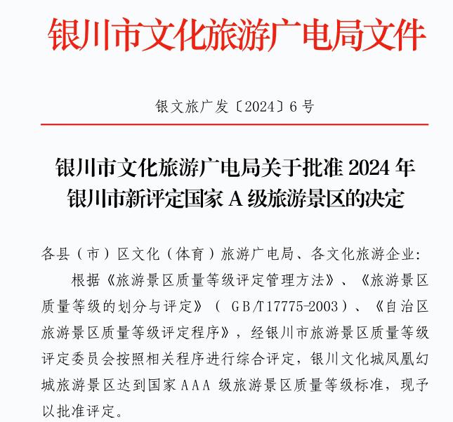 祝贺!近日,银川市文化旅游广电局下发批复文件,银川文化城凤凰幻城正式被获为国家3A级旅游景区。截至目前,金凤区拥有3A级景区8家。